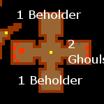 The cave is divided in four rooms with a total of two Bonelords and one Ghoul. In the northern room there is also a hidden pick hole which leads to nothing but some squares in between two barriers.