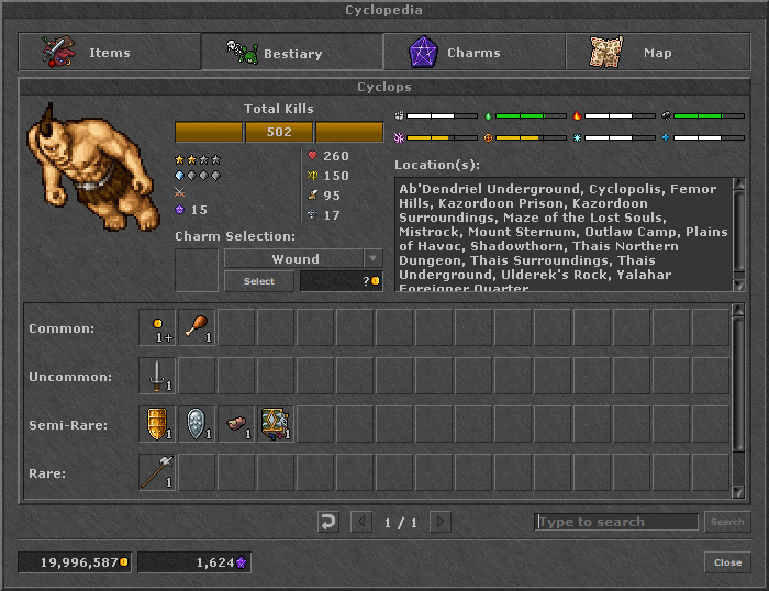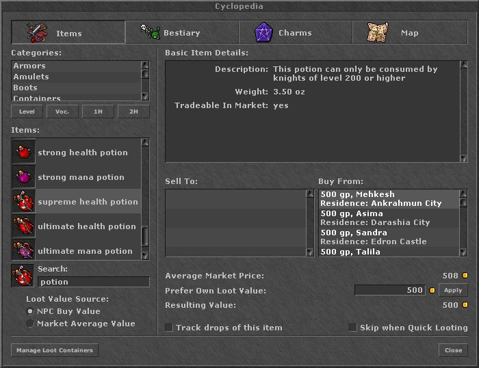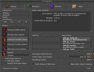 The Cyclopedia is used to change items' prices tracked by the Analytics Selector widgets. Players can select for each item if it will be tracked according to the NPC price or average Market price. Additionally, Premium players are able to set their own loot value for each item. Based on these prices you can use the widgets to keep track of the dropped loot and also analyse the loot value and supplies used during your hunting session.