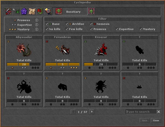 The Bestiary is the collection of knowledge acquired by your character about Tibia's Creatures, which are sorted in different Classes. Initially, every creature and the creature class itself will be displayed as silhouettes. You can gain information about creatures and thereby unlock and complete their Bestiary entries.