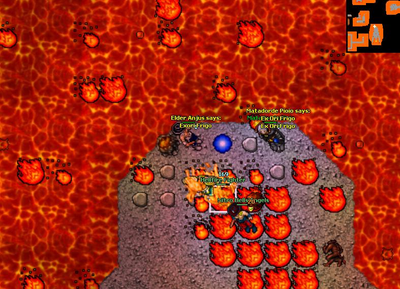 The entrance is a small way rounded by lava with 6 Hellfire Fighter and some Fire Devil and Fire Elemental that leads to The Inquisition Quest main room. Here is located most of dangerous demons of tibia and the The Ruthless Seven Minions.