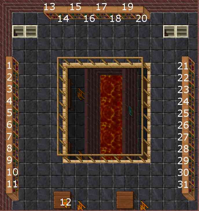 The library is located in Demona. It is split up in several sections: the quest-room, the "library" (2 floors) and a few bookcases near the teleport to the surface.