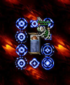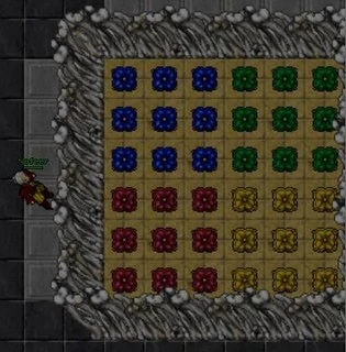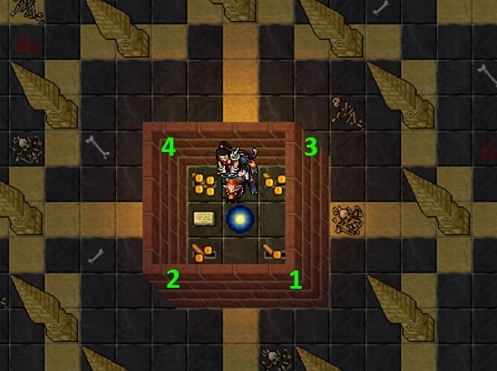 Now you are in a long curved hallway and you can see into a weird room. Enter the South teleport and you will be in a small room with 4 switches and a teleport. Flick all 4 switches in the order described in the image below (SE, SW, NE then NW), and all the walls will disappear. Begin healing yourself or cast mana shield, you will take more and more damage from the 12 Ominous Pillars that surround you.