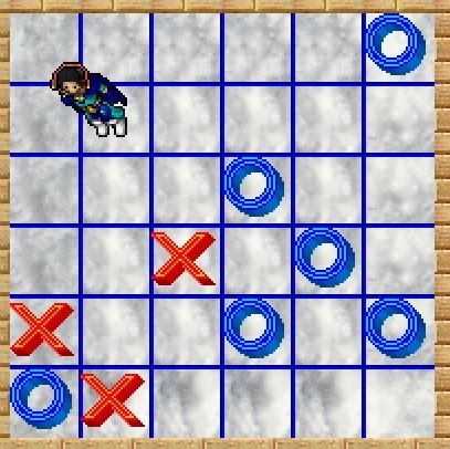 Begin by walking south west, move the switch north of the white pillars. There is an NPC south here that is a Ghostly Woman. She will tell you about the Tic Tac Toe puzzle. She says she is cold and wants Boots. You do not need to get Boots though. Go east and enter the room with the beds. Open the only Chest (Quest) in the room to get the Book of the Lost Heroes. Walk north to the Tic Tac Toe place. There will be 36 spaces, 6 rows and 6 columns. Each name in the Book of the Lost Heroes is 6 letters long and there are six names. Move the switch to make an X and O appear. Any name with an X or O in it, pretend you are writing it on the line. Say the first name was something like—X-O-, you would leave the first two spots blank, the third would have an X, the fourth would be blank, the fifth would be O and the sixth would be blank.