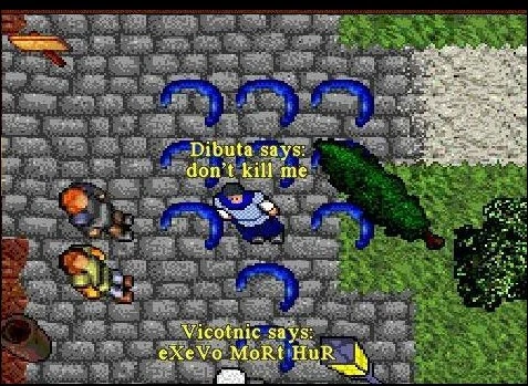 You could recognise gamemasters by the abbreviation "GM" at the beginning of their name. Also, gamemasters wore a special blue outfit which was not available to regular players. Gamemasters could send messages in red text and also broadcast them to the entire server to make sure people will pay attention to what they are saying. Finally, please note that since gamemasters were standard in-game player characters they were permanently level 2.