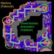 The maps indicate a way which you will encounter less of the strong quara (you do not have to follow them). The green areas are the places you will go for the Yalahari's bad side, whereas the yellow shows Palimuth's good side. Until the 2nd map you will only meet Quara Constrictors and Quara Mantassins. On the last floor you will also meet Quara Hydromancers, Quara Pinchers and Quara Predators.