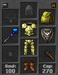 In the Inventory you can check your character's items and capacity. In the Stand-Alone Client the Inventory is grouped with the Combat Controls, Soul Points, and Special Conditions. These are separate windows in the Flash Client.