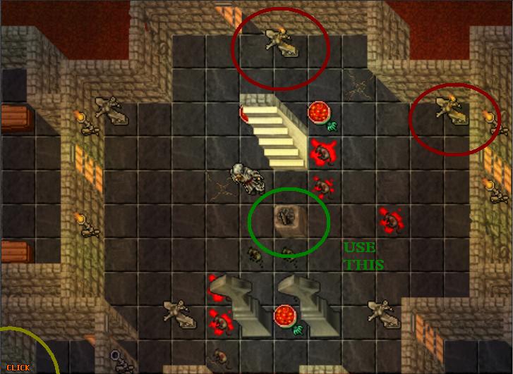 You must open the staircase to go deeper. To do so, light the 2 torches (statues) to the north and east and ensure the others are turned off, before using the Ancient Sundial by the stairs. You will hear a "CLICK" sound in the south-west room. Go down the staircase that has been revealed in the coffin in that room.