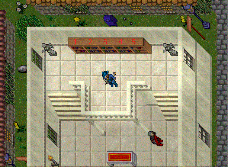 The library is located one floor up in the temple of Liberty Bay, northwest of the depot.