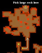 - Go to the small room in to the north. There will be a large rock over a hole. Use a Pick on the rock until the rock breaks, then go down the hole. WARNING! While destroying the rock you lose Hitpoints.