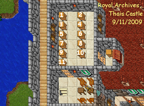 Most of the documents in these archives were written on behalf of king Tibianus I. They can be found to the southwest of King Tibianus' throneroom in the Rain Castle, up one level and north.