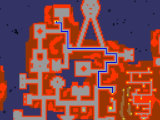 35 - go north east with the corridor, then south east and go into the blue flame, then continue with the road and go up in the rope hole.