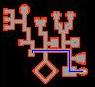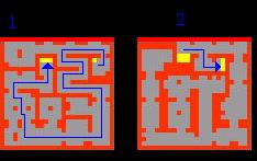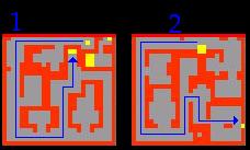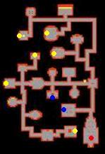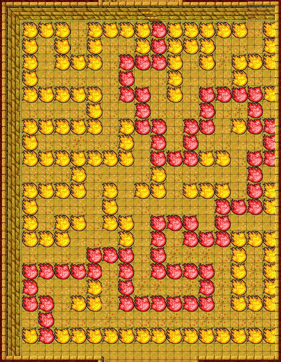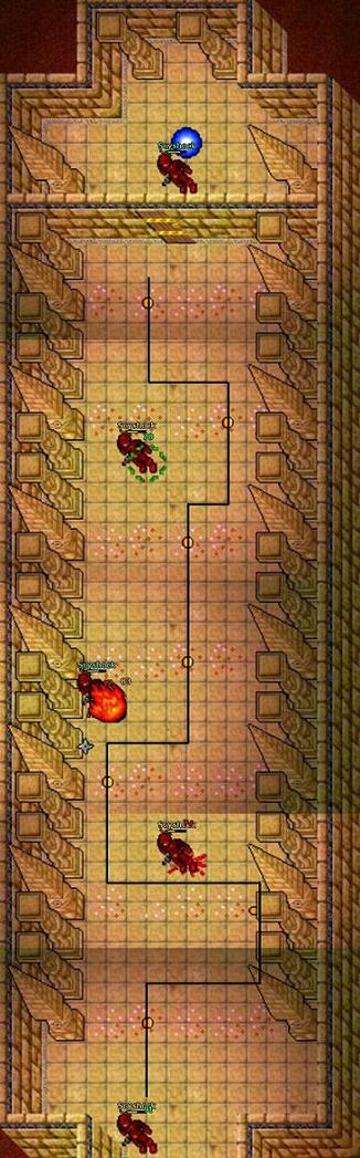 4. You're now faced with an invisible wall maze. In the image below the fires represent walkable tiles. The red fires indicate the correct route to go. Enter the teleporter to the south to appear at Omruc with 2 Stalkers, 6 Magicthrowers and 6 Shredderthrowers.