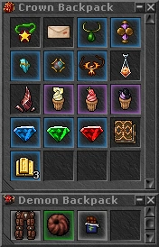 Two Demon Backpacks and one Crown Backpack (item order may vary) like the ones shown by the screenshot above were hidden in different Libraries in every Game World. The raffle code was written on the Letter. The following text was written on the CM Token by either CM Burchan or Mirade:
