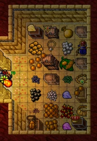 Omruc keeps a vault of treasures safely guarded behind his trademark red sparkle walls. Notable treasures are a Crown, a Holy Scarab, Some Golden Fruits and several Gold Nuggets.